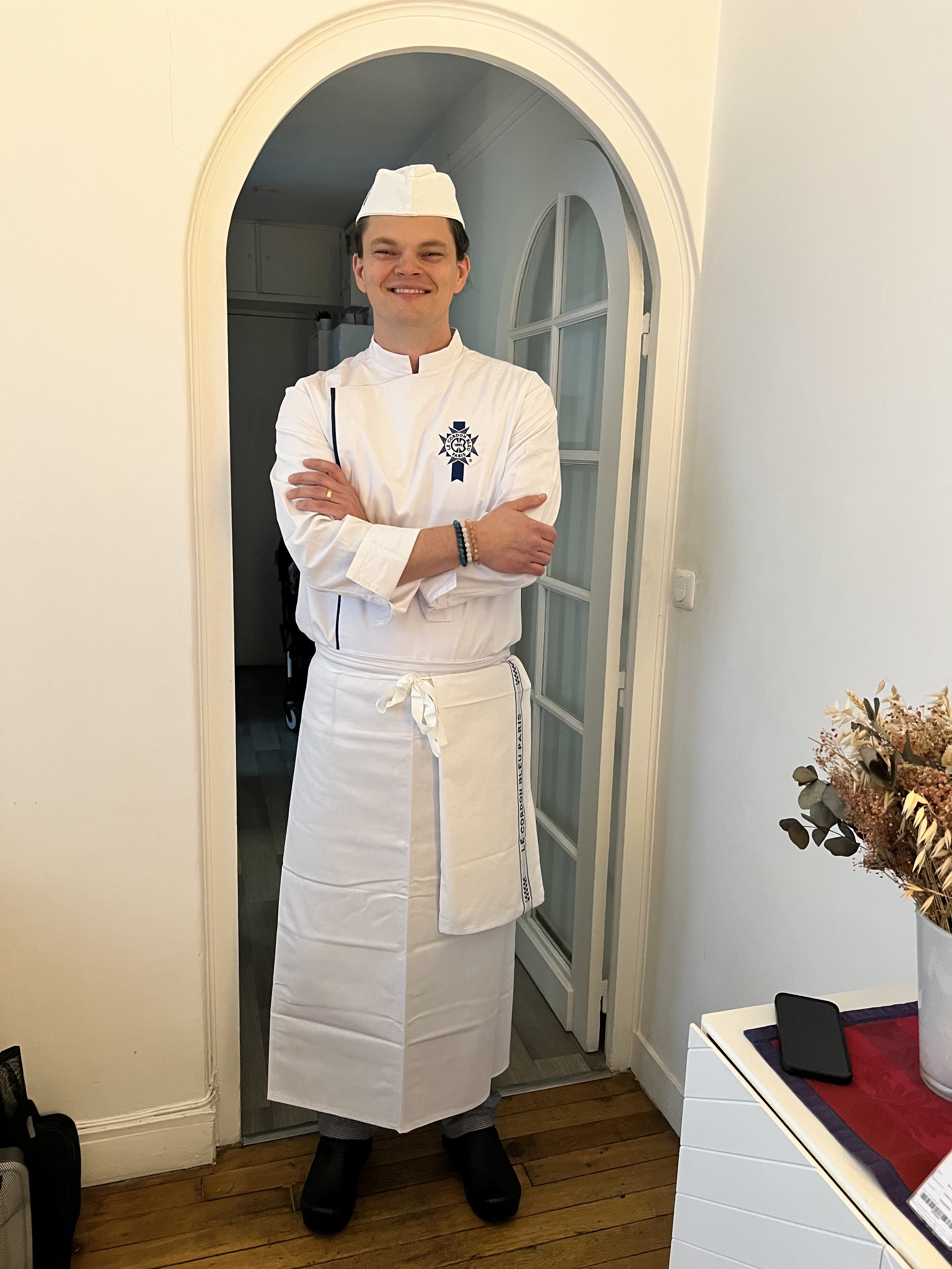 Inside LCB, every student is expected to wear a uniform. For demos and lectures, we have to wear our jacket, pants, safety shoes, and a tour de cou (a “neck tie”) which is just a white bandana tied in a four-in-hand style knot. Inside the kitchen for practicals, we add to it: a white apron that wraps almost all the way around us and hangs down to the ankles, a torchon (“tea towel,” not used for wiping or cleaning but for grabbing hot things), a calot (which is our cook’s cap) and pour moi and the other longhairs, a hair net. The uniform is expected to be clean and pressed and we are graded on it.