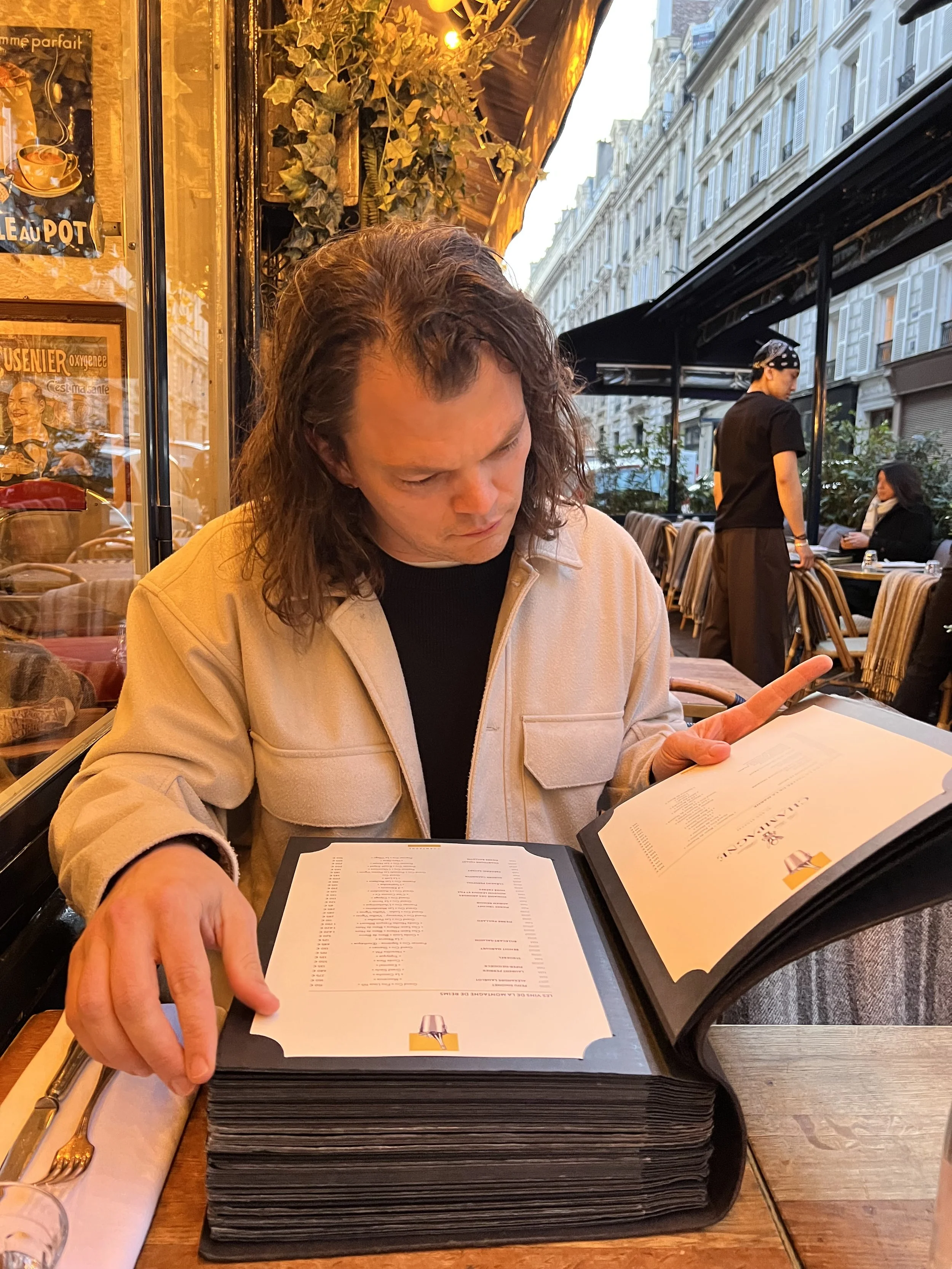 The wine list is a book. That’s not an exaggeration. It’s a dense, thick, heavy, hardback book of wines divided by region. Katy usually prefers bubbles, or at least something light. I’ve got a pretty wide appreciation for a lot of styles, and for a big bistro dinner, I knew we needed something red. We settled on the Loire Valley, and while I was starting to sift through the catalogue, I was saved by a sommelier (which is a word derived from “pack mule,” I recently learned from a great book called Cork Dork). She asked which grape I prefer (Cabernet Franc, at least for this dinner) and recommended a couple of bottles. We chose one, she went to get it, came back announcing they didn’t have it, and offered instead the first one she had recommended. Sold.