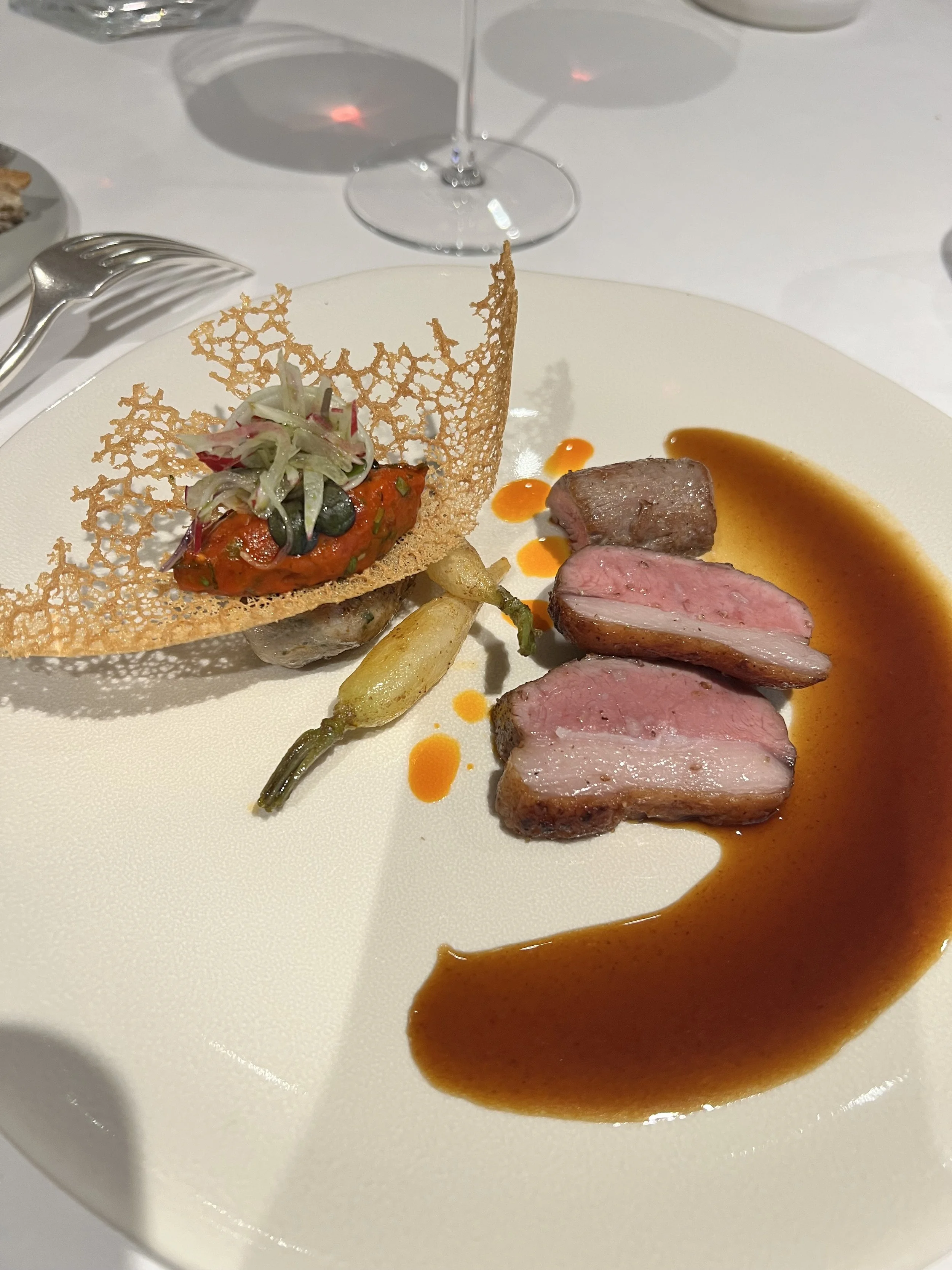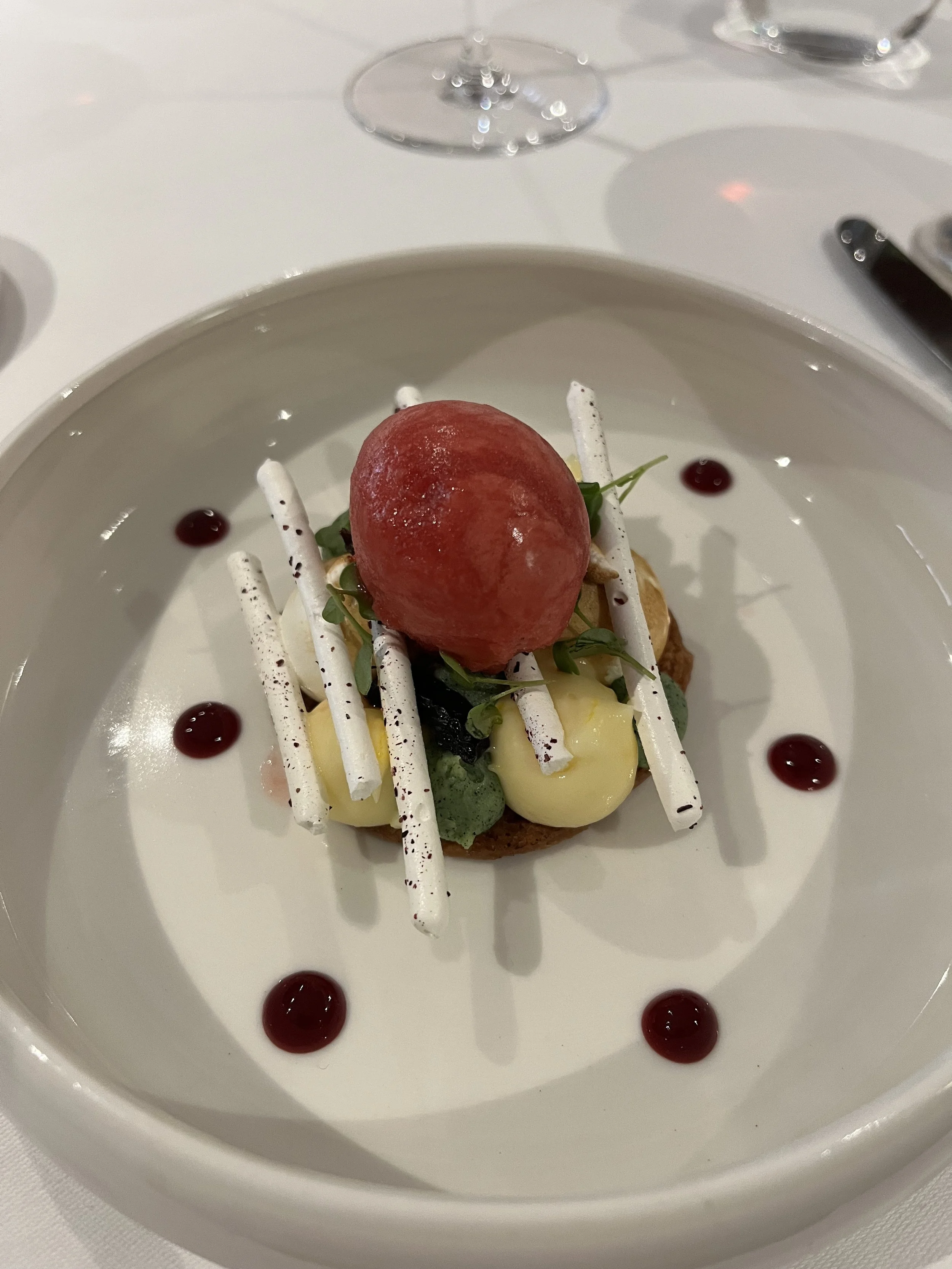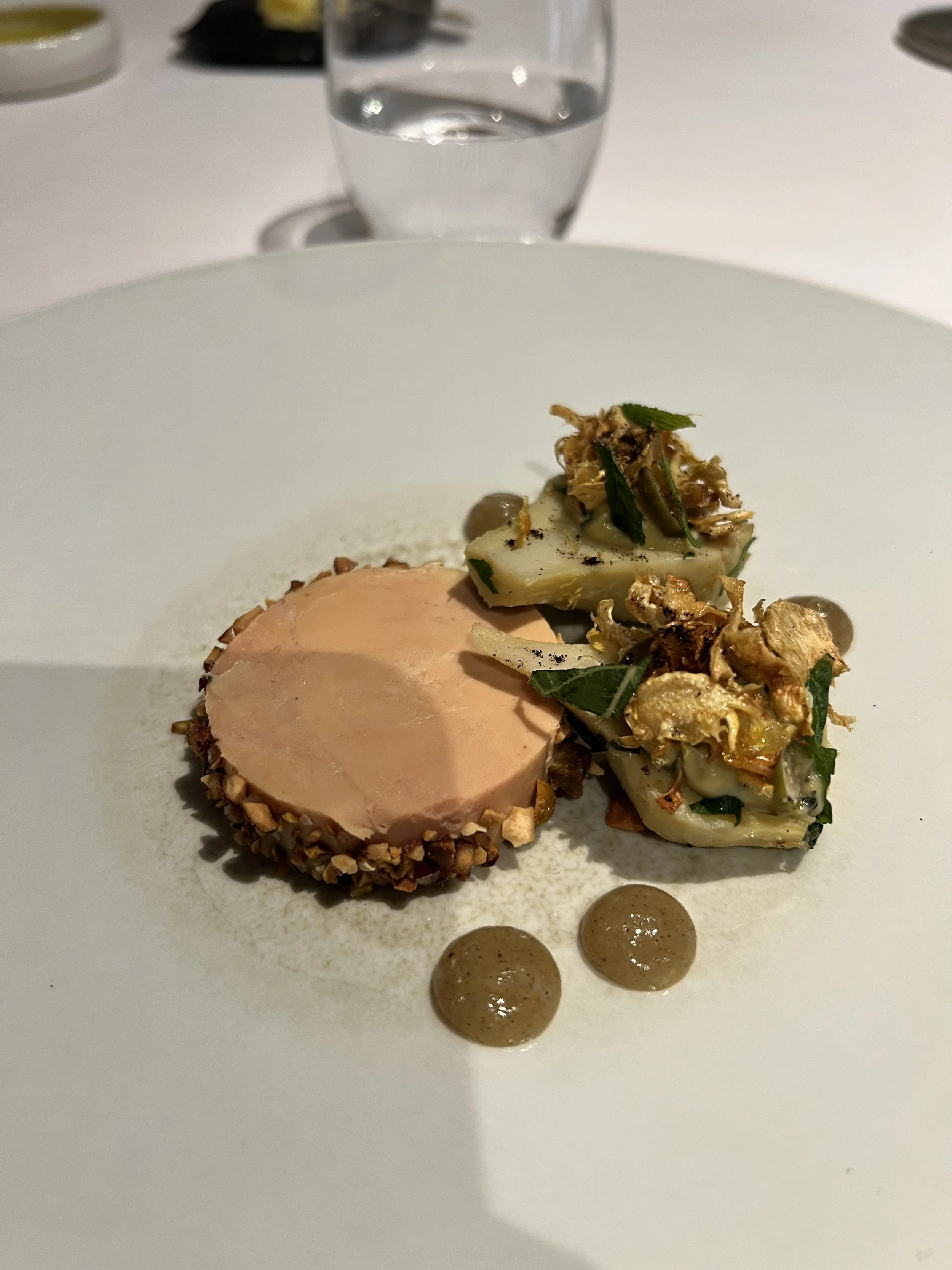 The service staff all wore suits. It didn’t feel stuffy, just…nice. We were offered an aperitif and chose a glass of champagne. Not long after, our welcome from the kitchen arrived: a slice of pâté en croûte, a specialty of the house and the region. Auggie enjoyed the pickled cherries served as an accompaniment but the texture of the pâté was too much for him.