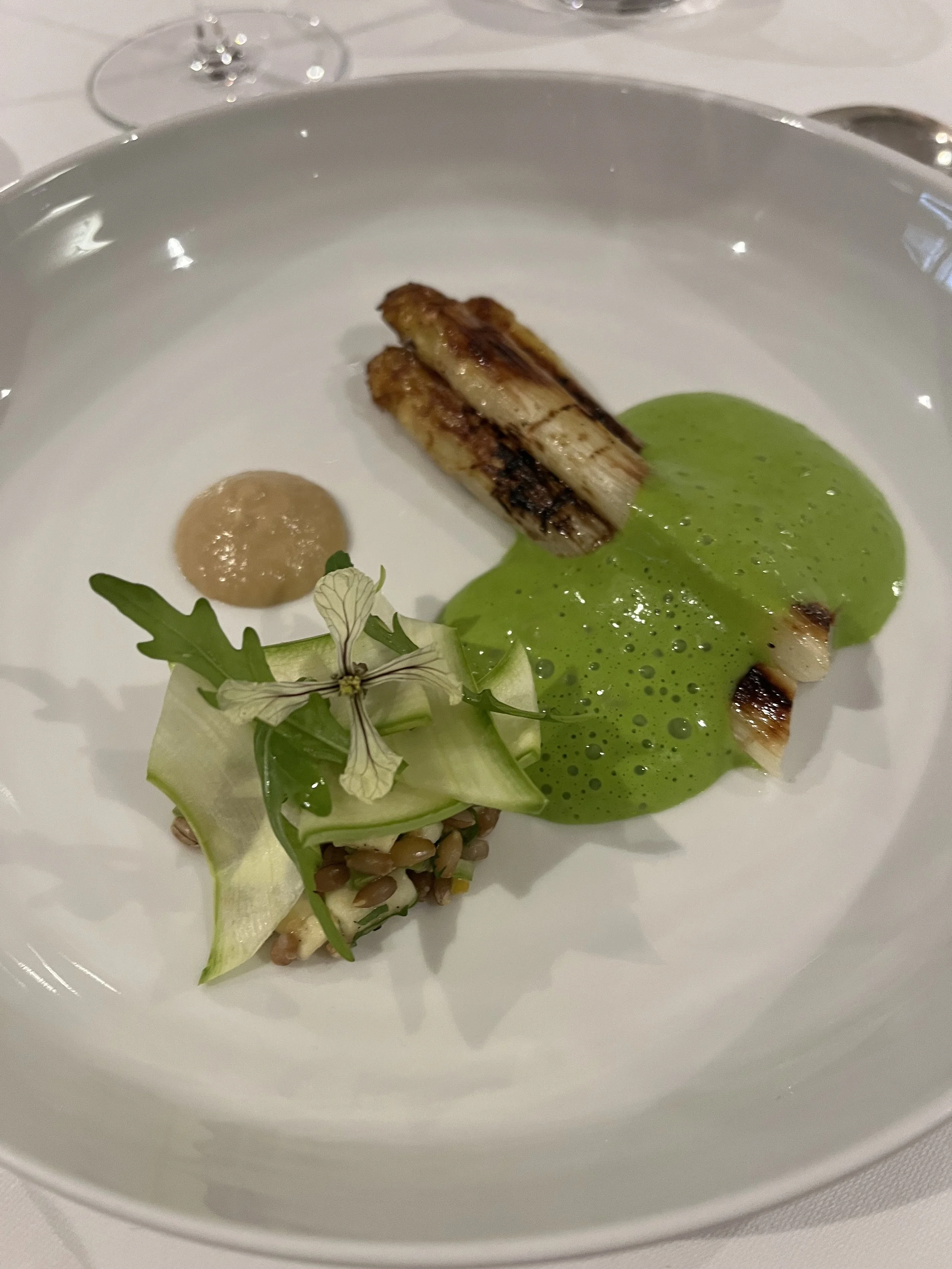 Cy’s entree: grilled white asparagus with rye grains and a sabayon of arugula and green asparagus. White asparagus is all over the marchés in France right now. It’s thicker than its green counterpart, but I’d never eaten it. The flavor is delicate but clearly benefited from being cooked hard over the grill. The sabayon was a dream: frothy, fresh, and buttery. They left the dish with extra sabayon, and Katy and I licked it clean.