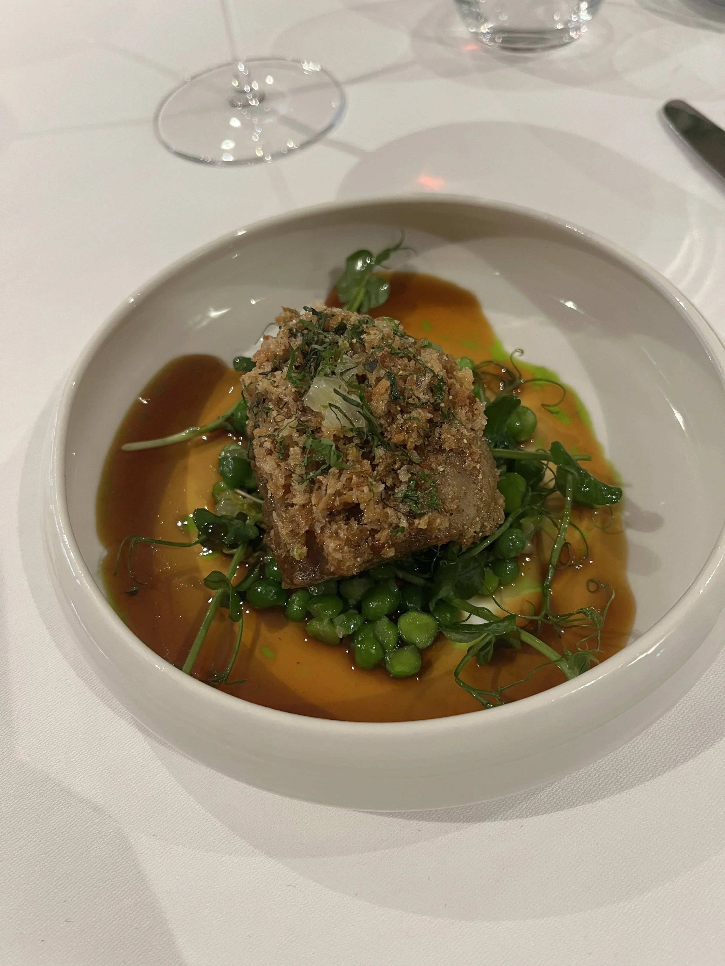 Cy’s plat: sweetbreads with French-style peas and a jus à la tagète. A tagète is a marigold, and while I don’t know if they were used in this “juice,” it was herby and beautifully bitter. If you’re unfamiliar, sweetbreads are literally nothing like what they sound like. They are actually either the thymus or pancreas, in this case from a calf. Tender, a tad gamey, and coated in breadcrumbs before being cooked in god knows how much butter, the richness was offset by the bright and vibrant peas—my favorite preparation of that vegetable.