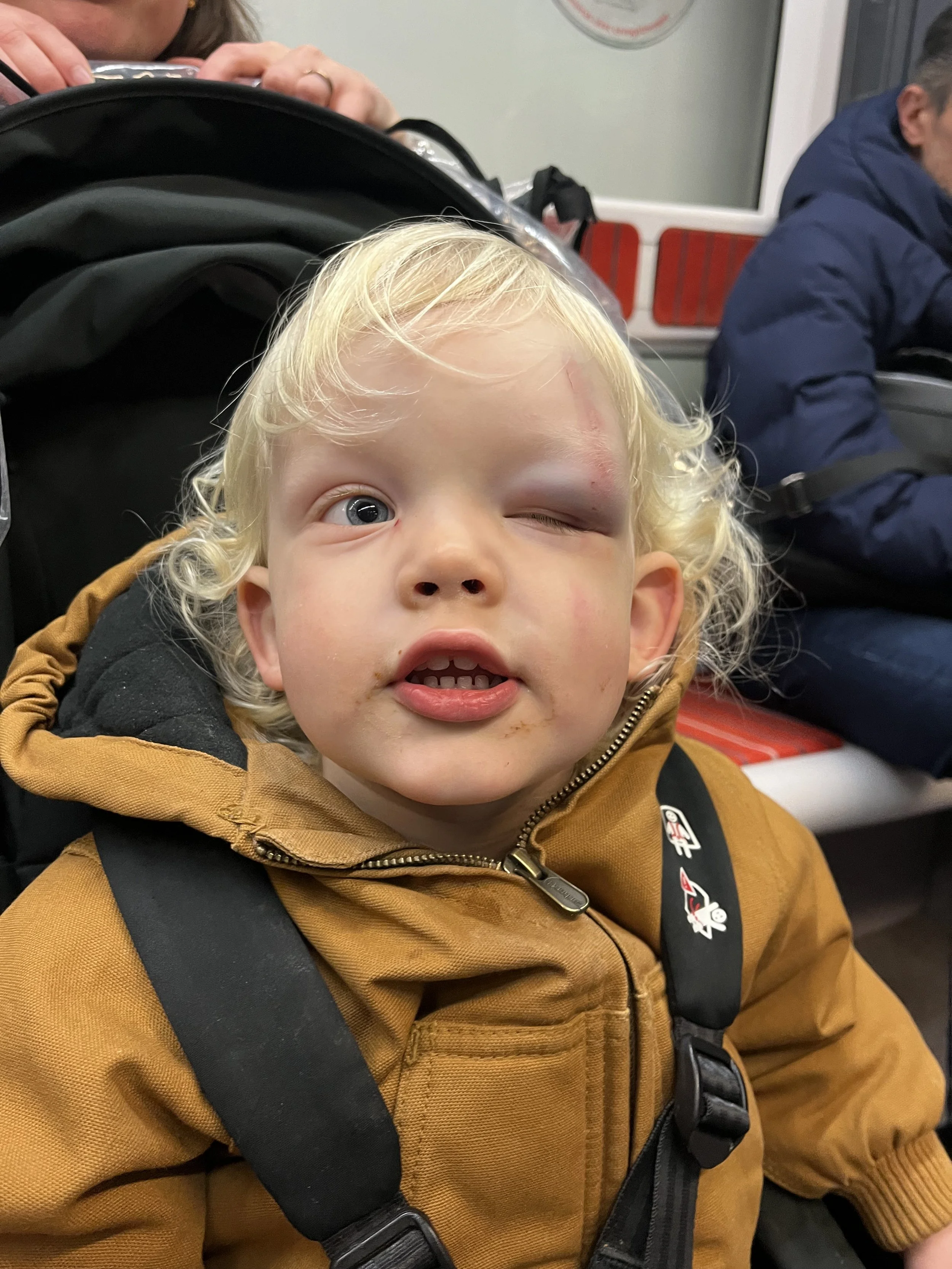 Auggie is ok, though he does look like he went a round or two with prime Mike Tyson. His eye swelled shut completely but it’s back open now. Such resiliency in that little boy. We’ve had to beg him to not run in the apartment, even now, and remind him of what happened. As I sat him down to breakfast the following morning he said, “Auggie fall there!” and pointed to the corner which walloped him. Pretty good for only being able to see out of one eye at the moment. He also reminded us no fewer than 3,000 times that he wants “to go on a big train.” He’s his old self.